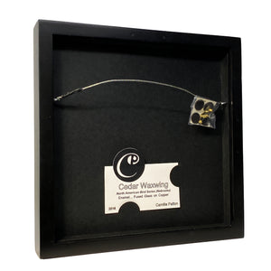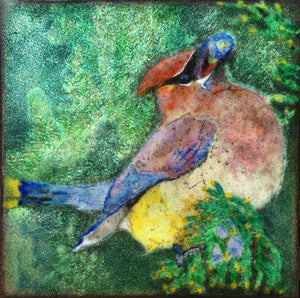 Cedar Waxwing is a single, enameled panel. The hammered surface texture increases the reflective sparkle and projects the bird forward from the background.