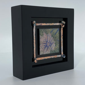 Framed Flower has one enameled panel that is surrounded by a separate, enameled ribbon frame. The panel’s soft, lovely pinks and contrasting blue shadows are repeated in the ribbon frame, and the panel’s moss greens complete the picture by providing a quiet background.
