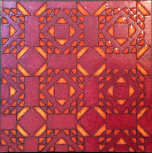 This single, enameled panel has used color and pattern to create a handsome visual illusion! What appears to be in front is really behind and vice-versa. In other words, the eye-catching, golden-copper triangles and trapezoids that look like a fiery background are actually raised layers of enamel on top of a flat, rich burgundy background. What a fun, yet sophisticated, piece.