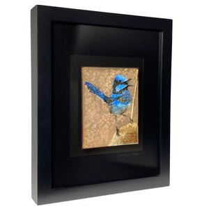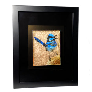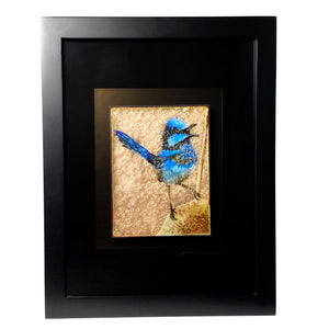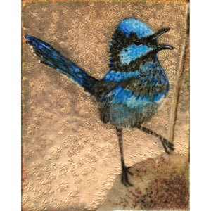 Superb Fairy Wren is a single, enameled panel. The hammered surface texture increases the reflective sparkle and projects the bird forward from the background.