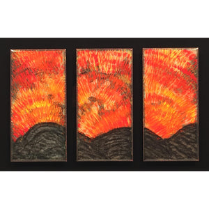 The Night Blaze triptych has three enamel panels, each depicting a portion of the complete scene. Blazing bright reds and oranges erupt in the night sky. Beneath the fiery image, glints of gold sparkle and dance with the smoke-filled air. The dark, mountainous foreground eclipses our view making us wonder what the source of such a show could be?!