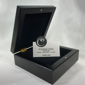 The beautiful vitreous enamel is set flush into the lid of this lovely Black box. The inside is lined with black velvet to protect your items. The lid is hinged and has a magnetic closure. We also include information about your special piece and the artist, and apply felt pads on the bottom- so you are ready to enjoy your new piece the minute it arrives!
