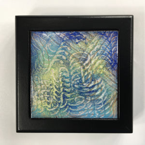 Strong blue hues mingle with gorgeous shades of turquoise, chartreuse, and yellows to create a vibrant backdrop to the energy of the lines in this abstract design! For centuries vitreous enameled objects have been highly prized as interior accessories, and the Colorful Vibrations Box is no exception. This versatile and durable work of art can fit in anywhere and will bring a touch of beauty and unexpected functionality wherever you place it.