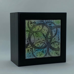 Swirling, interconnected dark grey circles float over the surface of an abstract design of blended soft blues, greens, yellows, and even a touch of pale, rosy lavender! For centuries vitreous enameled objects have been highly prized as interior accessories, and the Dark Circle Box is no exception. This versatile and durable work of art can fit in anywhere and will bring a touch of beauty and unexpected functionality wherever you place it.
